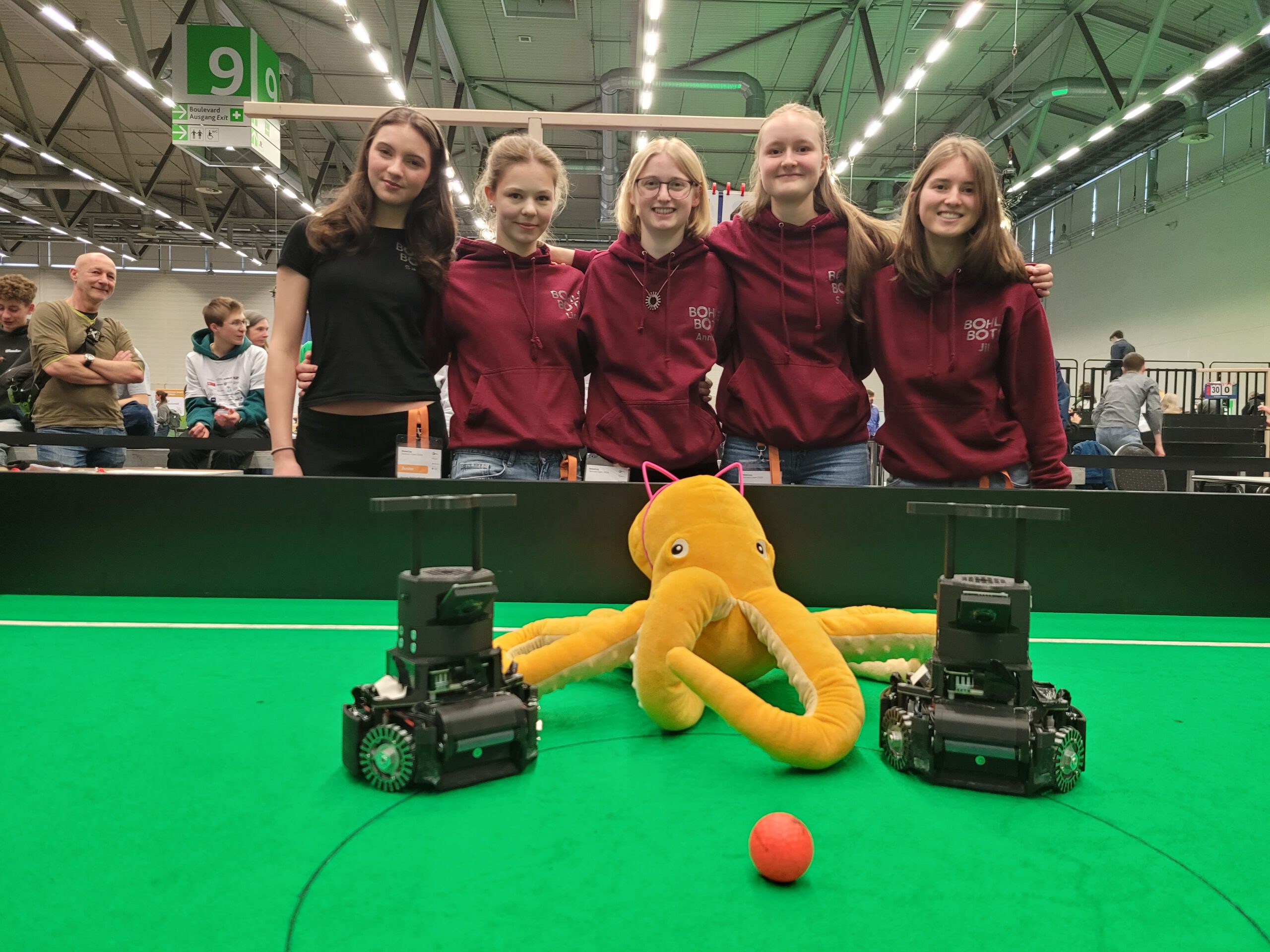 Die Robotik-AG unseres Gymnasiums Haan, die Bohlebots sind zum dritten Mal deutscher Meister im Robocup Soccer geworden. Das Team „Bohlebots Atlantis“ konnte sich in der vergangenen Woche auf der German Open des Robocup in vier spannenden Wettbewerbstagen gegen alle anderen Teams in Deutschland durchsetzen und gewann ungeschlagen alle Spiele und sicherte sich scheinbar mühelos den begehrten Titel. „Mühelos sieht es nur am Spielfeld aus“ erklärt Coach Roland Stiebel, der die Bohlebots 2008 gegründet hat. „Die Tausenden von Stunden mühevolle Vorarbeit kann man nur erahnen, wenn man sieht, mit wieviel größerer Perfektion unsere Roboter mit dem Ball umgehen als andere Teams“. Das kann auch Lisa bestätigen: „Die Roboter der anderen Teams sind auch nicht schlecht, aber das hat uns nicht gereicht. Wir wollten einfach die besten Soccer-Roboter Deutschlands bauen, und das ist uns gelungen“. Runde um Runde, Spiel um Spiel zeigten die fünf Mädchen im Alter von 17 bis 19 Jahren mit ihren Robotern, dass es sich auszahlt, schon Monate vorher an Details zu feilen, die Strategie immer wieder zu optimieren, Konzepte zu überdenken, und mit einem Zeitaufwand zu trainieren, der für viele schlicht unmöglich erscheint. Dabei musste der Roboter unzählige Mal zerlegt und neu wieder zusammengebaut werden. „Das mache ich inzwischen fast blind“ meint Sophia, die Mechanikerin des Teams, „wir sehen inzwischen, wenn ein Bauteil einen Zehntel Millimeter schief sitzt und korrigieren das sofort.“ Das zahlt sich aus, denn der Roboter des Teams ist währen der gesamten German Open nicht ein einziges Mal ausgefallen. „Wir sind seit der 5. Klasse in der Robotik aktiv und haben über die Jahre natürlich wahnsinnig viel gelernt“ berichtet Sarah, „letztes Jahr waren wir schon auf der Europameisterschaft und seit dem arbeiten wir täglich daran, dieses Jahr zur WM fahren zu können“. Und dies ist auch gelungen. Mit dem Meistertitel kommt ebenfalls das Ticket zur Robocup Soccer Weltmeisterschaft in Südkorea Anfang Juli diesen Jahres. „Bis dahin wollen wir noch einmal unsere KI verbessern, um andere Roboter noch besser erkennen zu können und neue Strategien zur Gegner-Umfahrung zu entwickeln“ erklärt Annika. Das Ziel ist klar, auch bei der WM wieder oben mit dabei zu sein. „Wir freuen und riesig“ sagt Jil, „dies ist unser letztes Jahr in der Roboter-AG und da ist es schon großartig, dass sich mit der Fahrt zur WM unser langjähriger Traum erfüllt.“