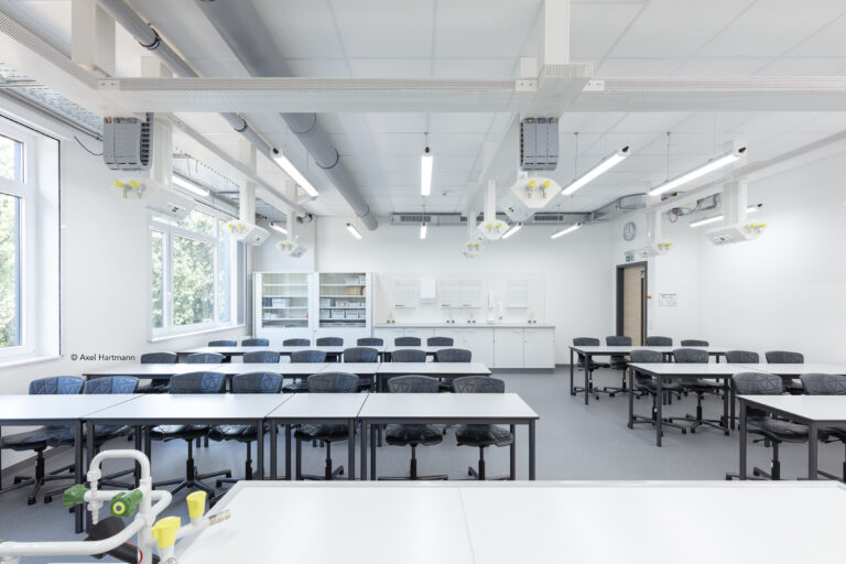 Wir verfügen auch über moderne Fachräume für die naturwissenschaftlichen Fächer (Biologie, Physik und Chemie) und speziell ausgestattete Räume für die angemessene Ausübung unserer Profile Robotik und Musik sowie auch der bildenden Kunst. Unsere große Aula, in der die traditionellen Musical- und Theateraufführungen und Schulkonzerte unserer Schülerinnen und Schüler jedes Schuljahr abgehalten werden, rundet unser Schulgebäude ab.